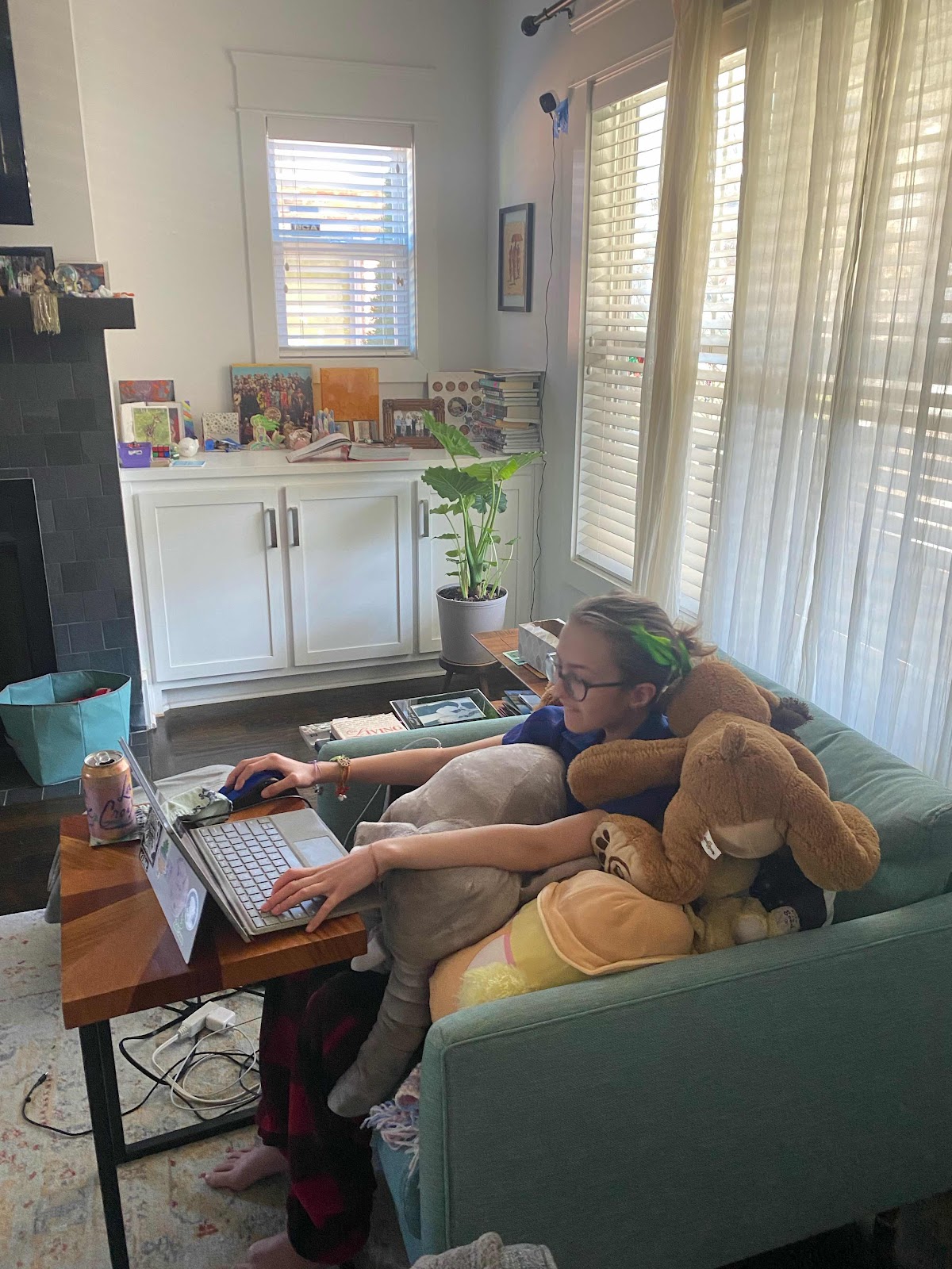 Playing Minecraft, covered in stuffies…